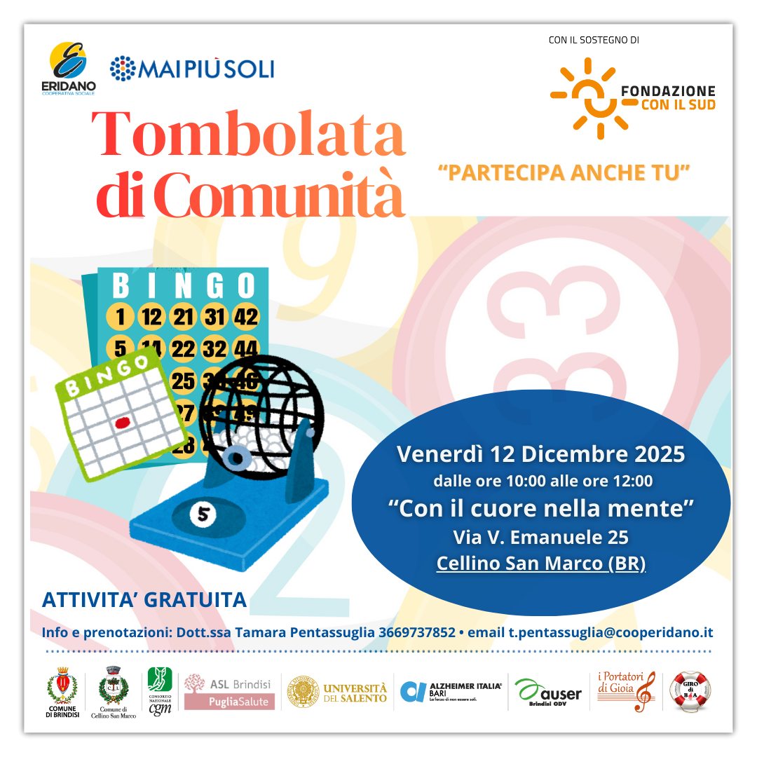 🎉 𝐓𝐨𝐦𝐛𝐨𝐥𝐚𝐭𝐚 𝐝𝐢 𝐂𝐨𝐦𝐮𝐧𝐢𝐭𝐚̀🎉 Siete tutti invitati a trascorrere una mattinata speciale con la Tombolata di Comunità! 𝐔𝐧’𝐨𝐜𝐜𝐚𝐬𝐢𝐨𝐧𝐞 𝐩𝐞𝐫 𝐢𝐧𝐜𝐨𝐧𝐭𝐫𝐚𝐫𝐬𝐢 𝐞 𝐜𝐫𝐞𝐚𝐫𝐞 𝐥𝐞𝐠𝐚𝐦𝐢 𝐚𝐭𝐭𝐫𝐚𝐯𝐞𝐫𝐬𝐨 𝐢𝐥 𝐠𝐢𝐨𝐜𝐨, 𝐥𝐚 𝐦𝐮𝐬𝐢𝐜𝐚 𝐞 𝐥𝐚 𝐜𝐨𝐦𝐩𝐚𝐠𝐧𝐢𝐚. L’iniziativa, promossa con il supporto dei 𝐯𝐨𝐥𝐨𝐧𝐭𝐚𝐫𝐢 𝐀𝐮𝐬𝐞𝐫 𝐁𝐫𝐢𝐧𝐝𝐢𝐬𝐢, rientra nel progetto “𝐌𝐚𝐢 𝐩𝐢𝐮̀ 𝐬𝐨𝐥𝐢”, 𝐬𝐨𝐬𝐭𝐞𝐧𝐮𝐭𝐨 𝐝𝐚 𝐅𝐨𝐧𝐝𝐚𝐳𝐢𝐨𝐧𝐞 "𝐂𝐎𝐍 𝐈𝐋 𝐒𝐔𝐃", che promuove il 𝐜𝐨𝐢𝐧𝐯𝐨𝐥𝐠𝐢𝐦𝐞𝐧𝐭𝐨 𝐚𝐭𝐭𝐢𝐯𝐨 𝐝𝐞𝐥𝐥𝐚 𝐜𝐨𝐦𝐮𝐧𝐢𝐭𝐚̀ 𝐩𝐞𝐫 𝐟𝐚𝐯𝐨𝐫𝐢𝐫𝐞 𝐥’𝐢𝐧𝐜𝐥𝐮𝐬𝐢𝐨𝐧𝐞 𝐬𝐨𝐜𝐢𝐚𝐥𝐞 𝐝𝐞𝐥𝐥𝐞 𝐩𝐞𝐫𝐬𝐨𝐧𝐞 𝐜𝐨𝐧 𝐝𝐞𝐦𝐞𝐧𝐳𝐚 𝐞 𝐝𝐞𝐢 𝐥𝐨𝐫𝐨 𝐜𝐚𝐫𝐞𝐠𝐢𝐯𝐞𝐫𝐬. 🗓️ 𝐐𝐮𝐚𝐧𝐝𝐨 𝐞 𝐃𝐨𝐯𝐞? 📅 𝐕𝐞𝐧𝐞𝐫𝐝𝐢̀ 𝟏𝟐 𝐃𝐢𝐜𝐞𝐦𝐛𝐫𝐞 𝟐𝟎𝟐𝟓 ⏰ 𝐃𝐚𝐥𝐥𝐞 𝐨𝐫𝐞 𝟏𝟎:𝟎𝟎 𝐚𝐥𝐥𝐞 𝟏𝟐:𝟎𝟎 📍 𝐂𝐞𝐧𝐭𝐫𝐨 𝐃𝐢𝐮𝐫𝐧𝐨 𝐂𝐨𝐧 𝐢𝐥 𝐂𝐮𝐨𝐫𝐞 𝐧𝐞𝐥𝐥𝐚 𝐌𝐞𝐧𝐭𝐞 𝐕𝐢𝐚 𝐕. 𝐄𝐦𝐚𝐧𝐮𝐞𝐥𝐞 𝟐𝟓, 𝐂𝐞𝐥𝐥𝐢𝐧𝐨 𝐒𝐚𝐧 𝐌𝐚𝐫𝐜𝐨 (𝐁𝐑) Vi aspettiamo... 𝐏𝐨𝐫𝐭𝐚𝐭𝐞 𝐜𝐨𝐧 𝐯𝐨𝐢 𝐥𝐚 𝐯𝐨𝐠𝐥𝐢𝐚 𝐝𝐢 𝐬𝐭𝐚𝐫𝐞 𝐢𝐧𝐬𝐢𝐞𝐦𝐞: 𝐚𝐥 𝐫𝐞𝐬𝐭𝐨 𝐩𝐞𝐧𝐬𝐢𝐚𝐦𝐨 𝐧𝐨𝐢!